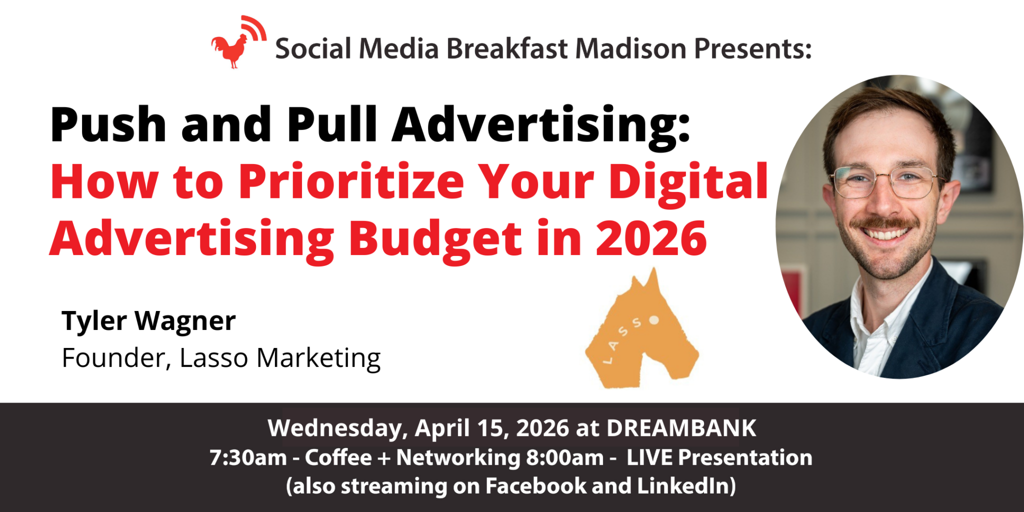 Push and Pull Advertising: Prioritizing Your Digital Ads Budget in 2026 April 15 @ 7:30 am - 9:00 am Dreambank 821 East Washington Avenue, Madison, Wisconsin A balanced paid media strategy wins customers today and creates demand for tomorrow. Tyler Wagner shares his thoughts at this month's SMBMad event.